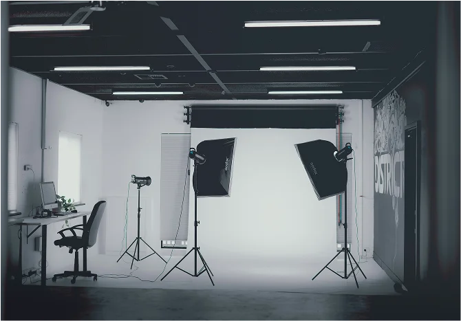 Our Studios consists of a 6 x 3 x 3m white cyclorama wall, 3-roll paper backdrops, pantographs and a full lighting setup that can be used for commercial shoots, reels, branded content, and editorials.